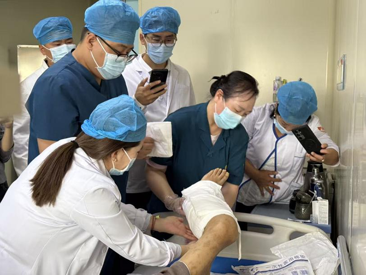 下午,訪問團的成員們分批進入手術(shù)室,參觀并參與清創(chuàng)、微粒皮種植等手術(shù),每一個操作細節(jié)的展示都幫助他們將理論知識與實際操作深度結(jié)合,有效提升了其對再生醫(yī)療技術(shù)相關(guān)手術(shù)操作規(guī)范的理解與掌握程度,為今后在本國開展同類手術(shù)積累了關(guān)鍵的實踐經(jīng)驗。觀摩活動結(jié)束之后,燒傷整形與創(chuàng)面修復(fù)科的醫(yī)生們繼續(xù)帶來了燒傷再生醫(yī)療技術(shù)治療壞死性筋膜炎、燒傷再生醫(yī)療技術(shù)救治糖尿病足臨床實踐效果的經(jīng)驗分享,并在分享結(jié)束后與蒙古國的醫(yī)護就兩國在再生醫(yī)療技術(shù)上的差異和不同經(jīng)驗展開了深入交流。通過對比兩國在患者體質(zhì)、診療環(huán)境、醫(yī)療資源配置等方面的差異,共同探討了技術(shù)本土化調(diào)整的可行路徑,為再生醫(yī)療技術(shù)在蒙古國的優(yōu)化提供了重要參考。