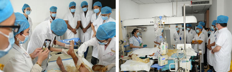 9月18日,代表團(tuán)赴瀏陽市開展醫(yī)療交流,先后訪問了瀏陽市中醫(yī)院與瀏陽市人民醫(yī)院。兩家醫(yī)院在再生醫(yī)療技術(shù)臨床應(yīng)用方面均擁有深厚積累,尤其在大面積燒傷綜合救治領(lǐng)域成效顯著。當(dāng)日上午,代表團(tuán)首先到訪瀏陽市中醫(yī)院,在燒傷科主任朱樹昌的陪同講解下,代表團(tuán)實(shí)地了解到了翻身床、懸浮床、紅外線照射等設(shè)備在大面積燒傷治療中的輔助應(yīng)用,并就中西醫(yī)結(jié)合模式在提升創(chuàng)面修復(fù)效果與患者滿意度方面的實(shí)踐路徑,進(jìn)行了深入交流。下午,代表團(tuán)轉(zhuǎn)赴瀏陽市人民醫(yī)院。周明亮院長結(jié)合典型病例,系統(tǒng)介紹了該院將大面積燒傷創(chuàng)面的治療經(jīng)驗(yàn)轉(zhuǎn)化應(yīng)用于慢性難愈合創(chuàng)面的臨床策略與關(guān)鍵技術(shù)。隨后,皮膚醫(yī)學(xué)中心主任蔣章佳與燒傷重建創(chuàng)面修復(fù)科主任焦獻(xiàn)功共同展示了獲專利認(rèn)證的醫(yī)院自研設(shè)備——磨痂器及環(huán)鉆治療術(shù),借助臨床案例生動(dòng)演示了該技術(shù)在處理大面積燒傷創(chuàng)面、慢性難愈合創(chuàng)面及瘢痕綜合管理中的顯著療效。訪問期間,代表團(tuán)還與兩院醫(yī)護(hù)人員圍繞再生醫(yī)療技術(shù)的規(guī)范化實(shí)施、治療流程優(yōu)化及植皮手術(shù)操作要點(diǎn)等議題,開展了廣泛而專業(yè)的座談交流。